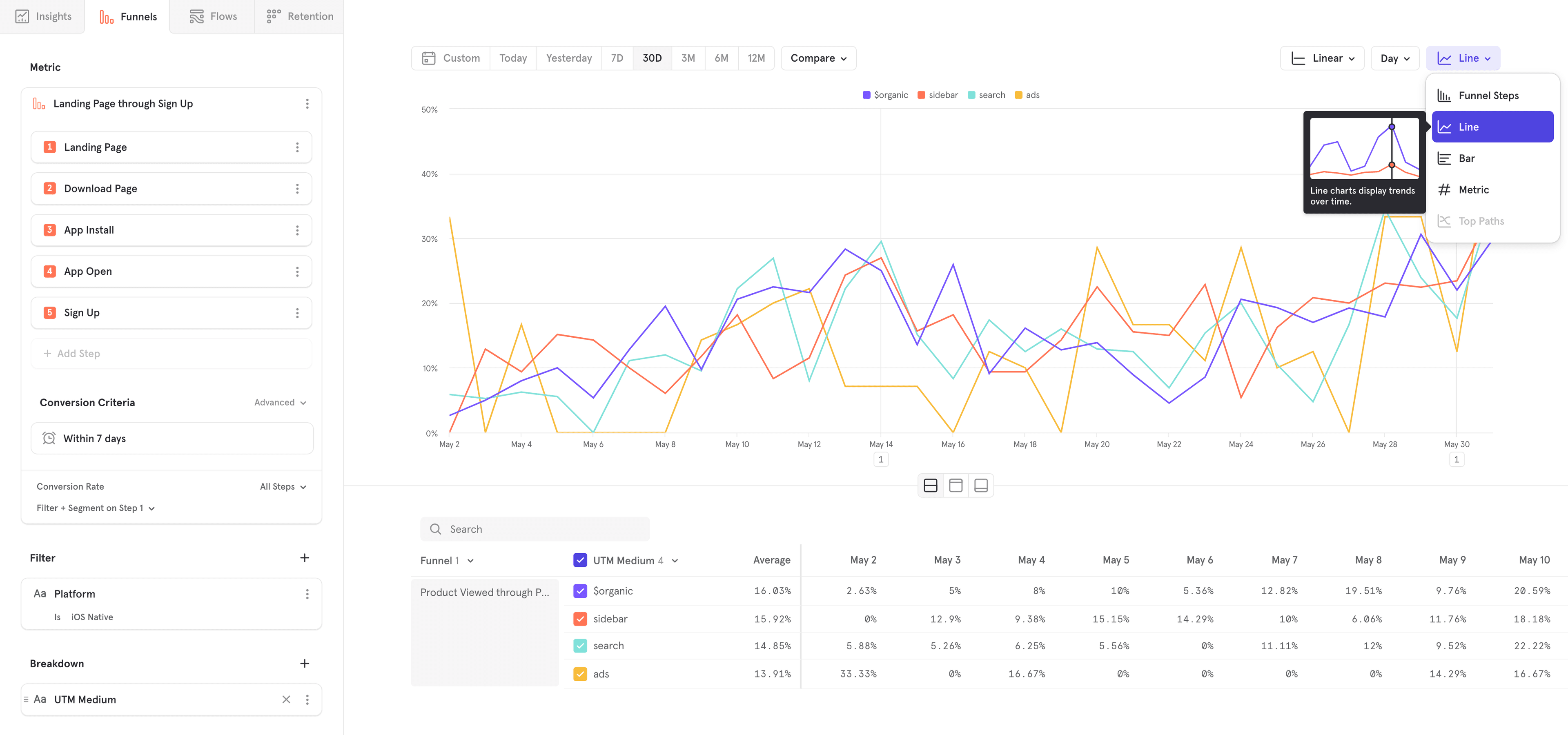 Breakdowns segment data into groups. In this case, we want to break our funnel down by marketing medium, tracked via UTM tags. Therefore, you can add a “UTM Medium” breakdown.